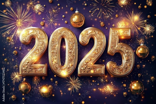 Golden glittering numbers 2025 with festive fireworks and sparkling golden baubles on a dark background celebrating the new year with excitement and joy