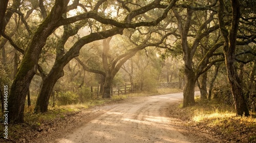 Golden light filtering through ancient oak trees onto a dusty winding road