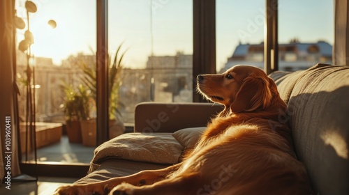 Golden retriever dog in an opulent living room with a wide panoramic window in the Scandinavian style. Hotel or homeroom that welcomes pets.