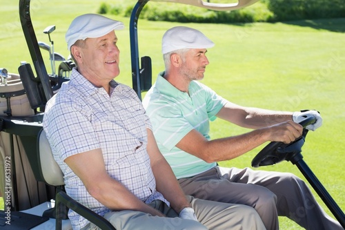Golfing friends driving in their golf buggy