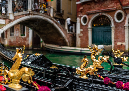 Gondola details with golden seahorse details in Venice, Italy. Traditional gondola on a popular water canal.