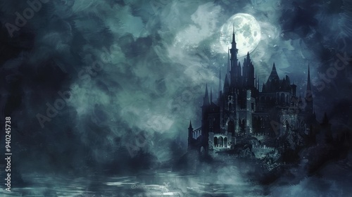 Gothic castle moonlit night eerie mist Watercolor