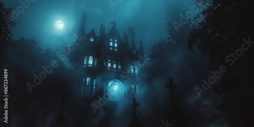 Gothic mansion in a pine forest, foggy evening, epic spooky atmosphere, grave crosses