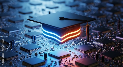 Graduation Cap on Microchip Circuit Board.