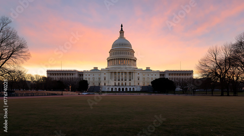 Grand architecture under a colorful dawn sky. A majestic building with a prominent dome rises above a lawn. A place where history is made and decisions are forged.