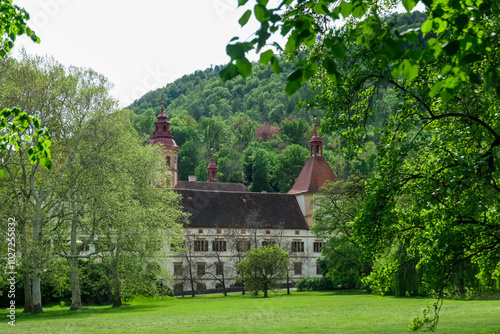 Grand imposing Baroque-style castle Eggenberg surrounded by lush greenery in Graz, Styria, Austria, Europe. Facade with intricate details, symmetrical design, and a central dome. Styrian State Museum