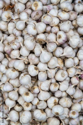 Gray heads of garlic lie on the market counter and form an abstract texture. Autumn agricultural fair.