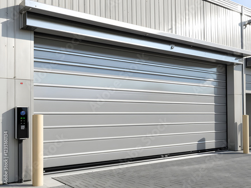 Gray roll-up industrial door with keypad entry and yellow bollards, set in a concrete frame.