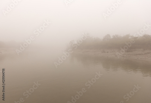 Great egret feeding in mangrove forest of Sundarban tiger reserve in foggy morning, India
