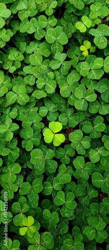 Green clover leaves with water droplets covering the surface, natural plant background with fresh dew and vibrant foliage for nature and spring concept.