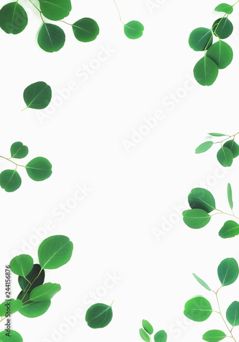 green eucalyptus leaves, branches, herbs, plants frame border on white background top view. copy space. flat lay