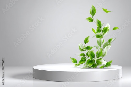 Green foliage explodes upwards from a white pedestal against a soft gray backdrop