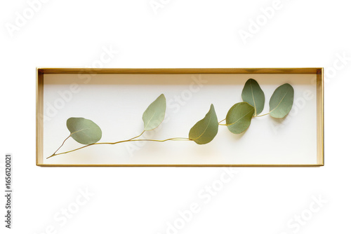 Green plant leaves with roots in a rectangular glass frame isolated on transparent background. Elegant rectangular gold frame with a sleek minimalist design isolated on white background.