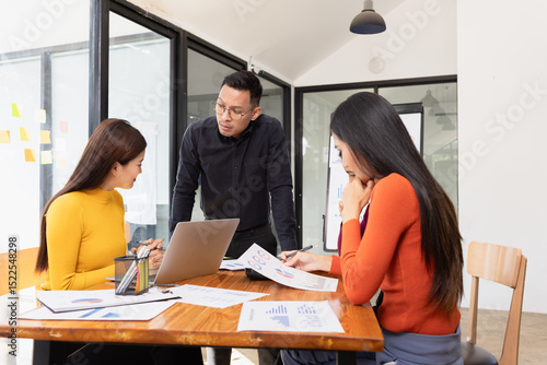 Group of Asian business working analysis project brainstorm in modern office, Asian businesspeople team working together, Business startup and company strategy planning concept.