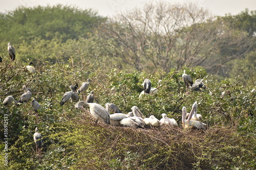 group of beautiful pelican and it's babies sitting on the tree, on the lake, in india and also we can see other white cranes.