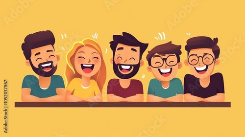 Group of five cheerful friends laughing together, colorful cartoon style, joyful atmosphere.
