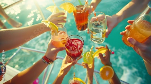 Group of happy friends cheering with tropical cocktails at boat party Young people having fun in caribbean sea tour Youth and summer vacation concept Focus on bottom hands glass : Generative AI
