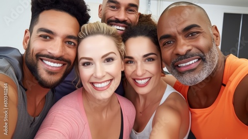 Group of happy people taking a selfie together in a yoga studio. Generative AI