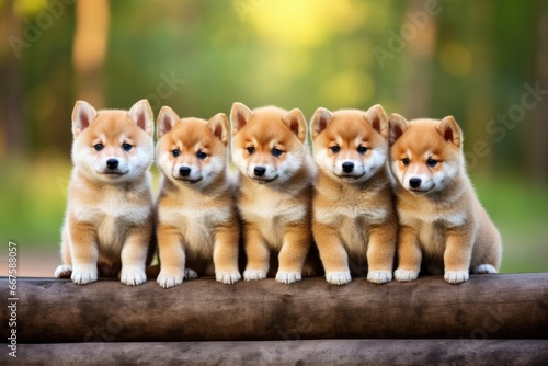 group of shiba inu puppies posing together on wooden background, perfect for pet lovers and advertisements, ai generated