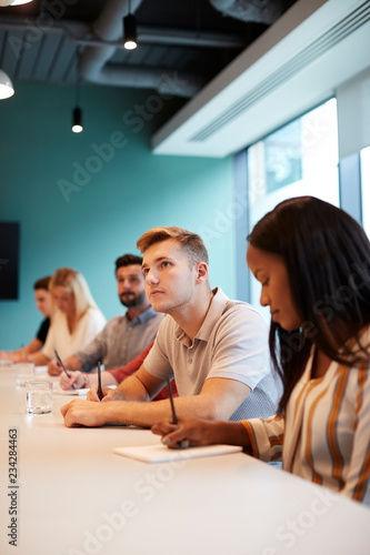 Group Of Young Candidates Sitting At Boardroom Table Making Notes At Presentation At Business Graduate Recruitment Assessment Day