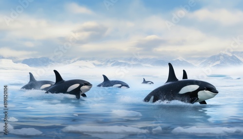 Groups of Orcas or killer whales swim and hunt for prey, the top of the food chain in a sea of ice floes