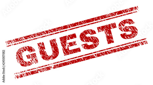 GUESTS seal stamp with corroded texture. Red vector rubber print of GUESTS text with corroded texture. Text tag is placed between double parallel lines.