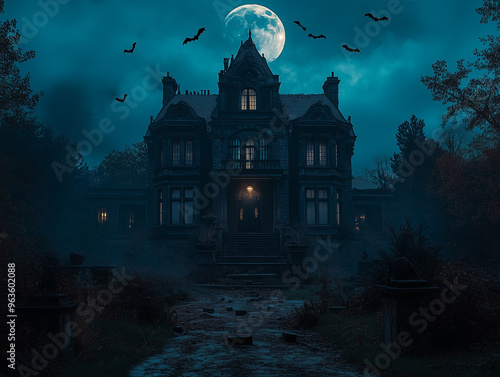 Halloween. Spooky haunted house at night with full moon and bats flying