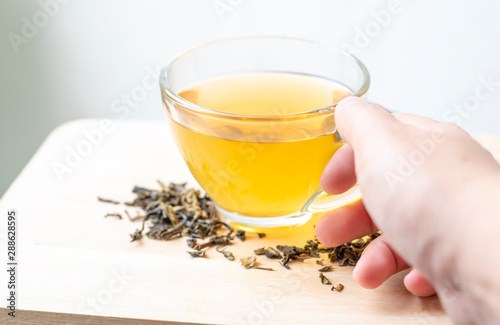 Hand catch up Cup of hot green tea and dry green tea leave on wooden table.