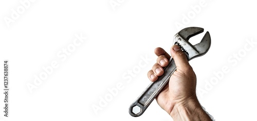 hand holding a large wrench. The hand is positioned in a way that the fingers are wrapped around the handle of the wrench, with the thumb and index finger forming a fist.