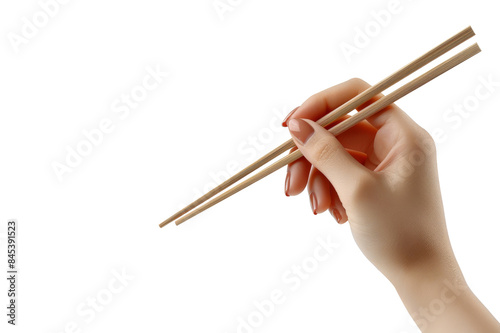 Hand holding chopsticks isolated on transparent background.