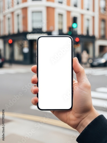 Hand Holding Smartphone in Urban Street Setting for Mobile Branding, Digital Marketing, App Promotion and Social Media Design