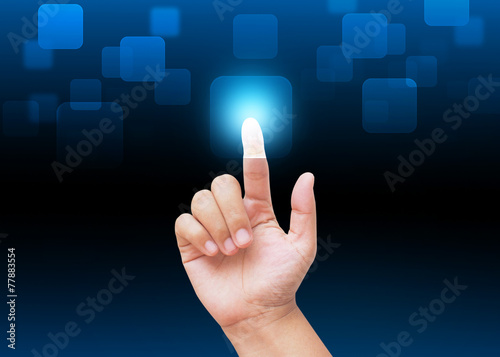 Hand pressing buttons with technology background