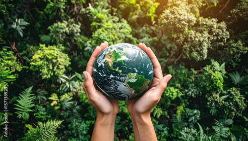 Hands holding a small Earth model against a lush forest symbolize environmental protection, sustainability, and global responsibility