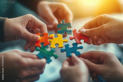 Hands join puzzle pieces, putting the jigsaws team together, business concept