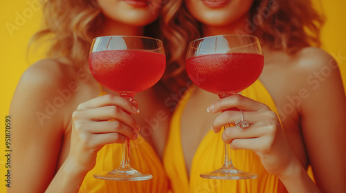 hands of two womens in evening cocktail shiny sequins dress are holding a glass of wine at a party