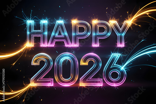 Happy 2026 text with vibrant neon glow and festive sparkler trails
