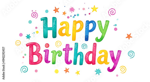 Happy Birthday text with colorful confetti and stars festive greeting card design for celebration isolated on white background.