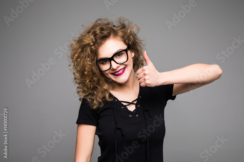 Happy businesswoman showing thumb up over gray background. Looking at camera