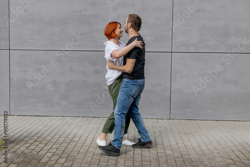 Happy dancers curling in dance in city. Romantic couple, woman with red hair and man in dark t-shirt and blue jeans dancing on street, on a gray background. International dance day.