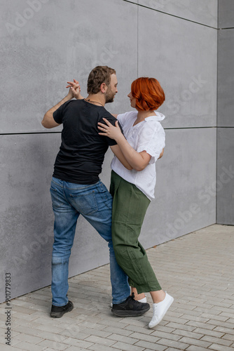 Happy dancers curling in dance in city. Romantic couple, woman with red hair and man in dark t-shirt and blue jeans dancing on street, on a gray background. International dance day.