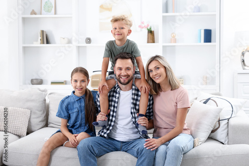 Happy family sitting on sofa at home