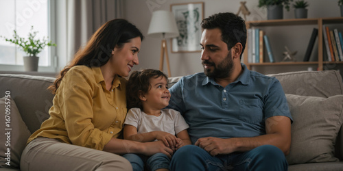 Happy family talking on the couch at home. Mother, father and son smiling and interacting in the living room.
