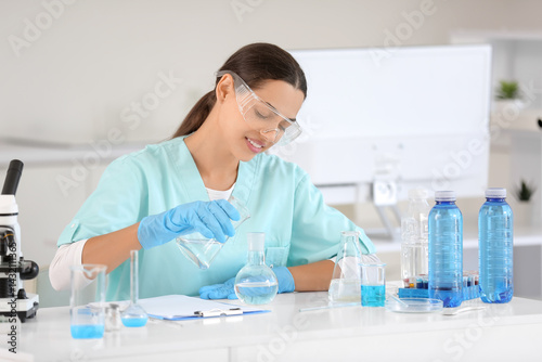Happy female young scientist with professional glassware examining water quality in research laboratory