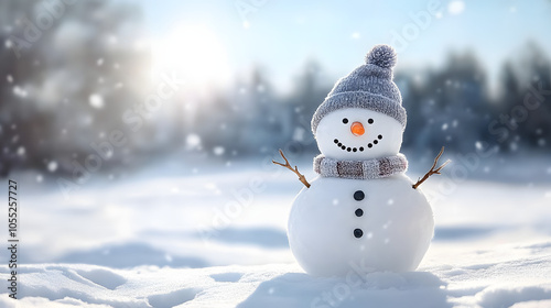Happy snowman in winter scenery with copy space, blurred bokeh snow magical white landscape background