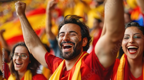 Happy spanish soccer fan with other supporters from Spain in stadium. Generated AI