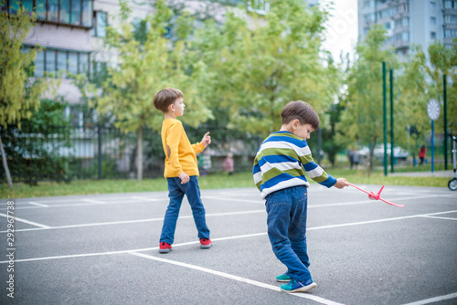 Happy two brother kids playing with toy airplane against blue summer sky background.