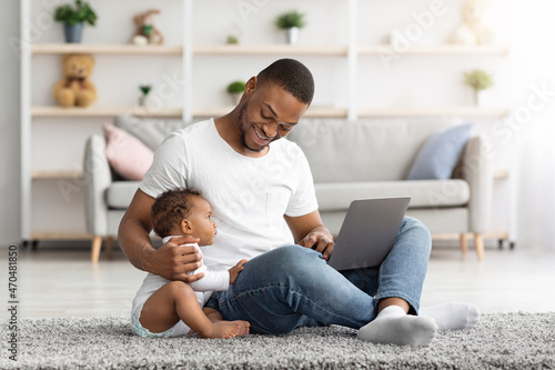 Happy Young Black Dad Using Laptop And Babysitting His Child At Home