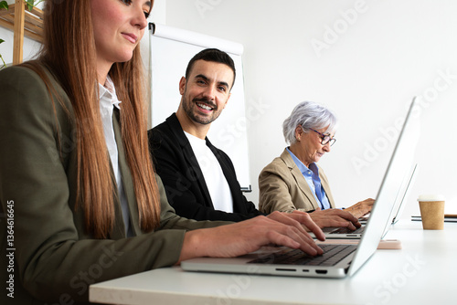 Happy young businessman looking at camera in the office. Colleagues working with laptop.