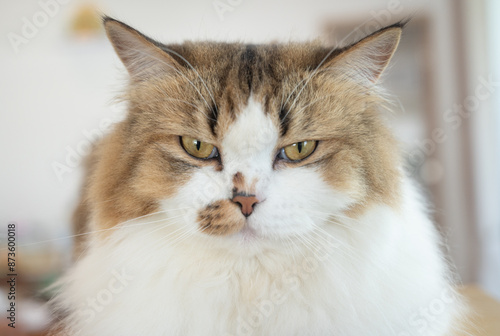 Headshot of angry Persian cat looking to you.