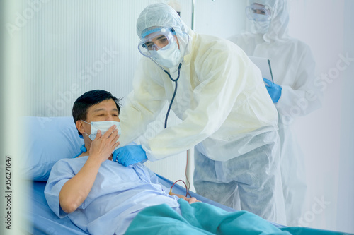 Health care staff with whole body protective suit in covid clinic protective room help to support and treatment the patient on bed. Concept of good heath care system support the therapy of patient.